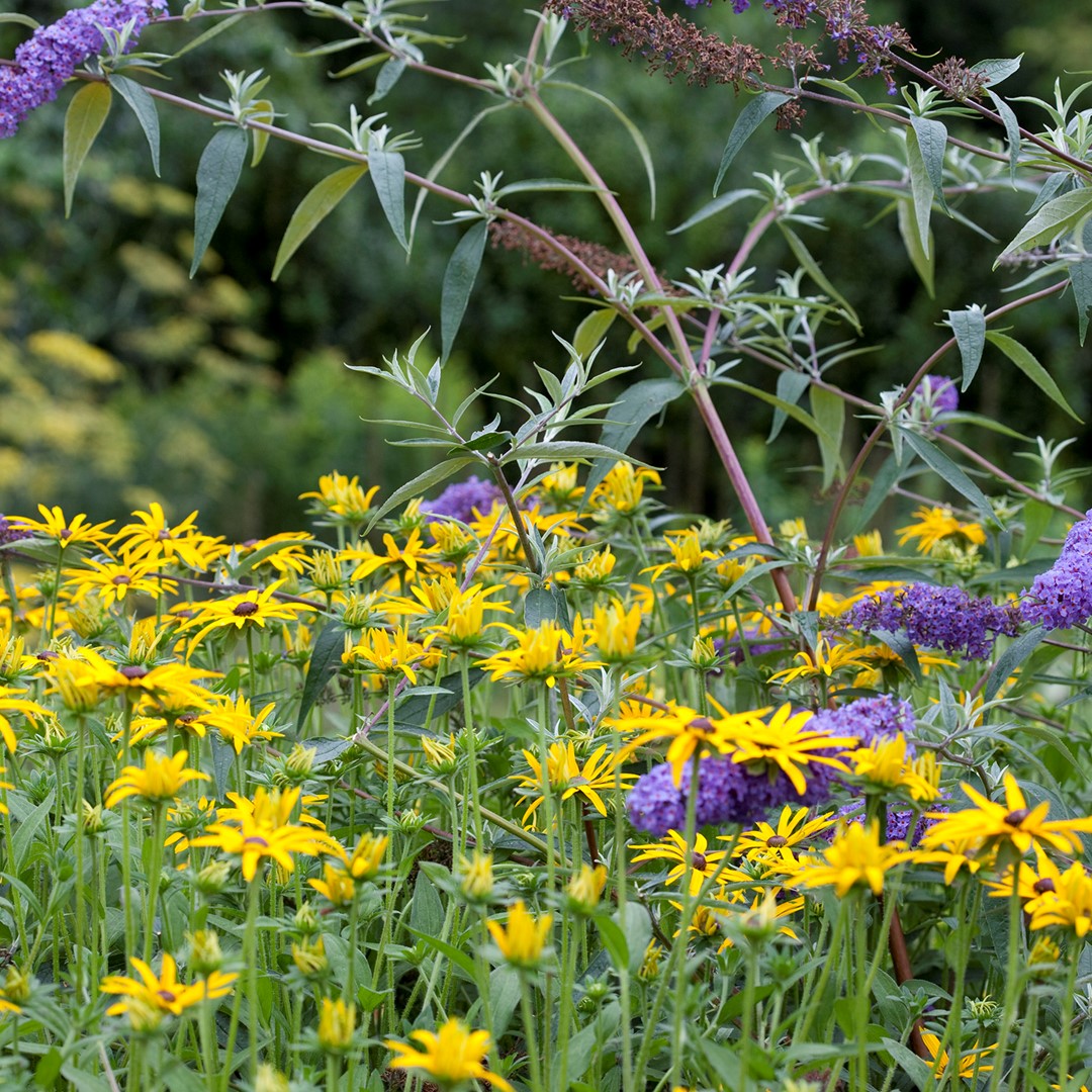 1. Schmetterlingsstrauch, Buddleja 'Nanho Purple'. Vollsonnig, bis 1,5 m, 7-9 Blüten, Strauch