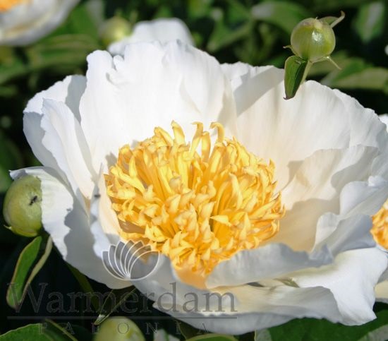 Eine Sorte des japanischen Typs mit klaren weißen Außenblättern und vielen eher kleinen leuchtend gelben Blütenblättern, die das Herz bilden. Sehr auffällig. Einige Seitenknöpfe. Robuster Wuchs mit sehr starken Blättern, die bis weit in den Herbst hinein kühlgrün bleiben. In ihrer Typ- und Farbkombination kennt sie wenig Konkurrenz, eine bessere ist wegen ihrer eleganten Ernte eigentlich kaum vorstellbar. Leider hat diese Art wenig Geruch. Da es sich um eine robuste Pflanze handelt, müssen Sie keinen Ring darauf setzen. Blütezeit von Ende Mai bis Anfang Juni für ca. zwei Monate.