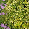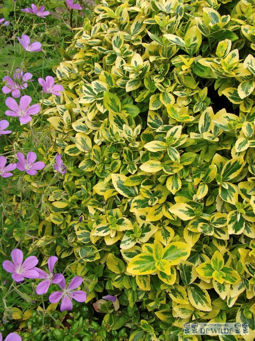Die Fortunei-Sorten sind die immergrünen Arten des Kardinalshutes. Sie werden auch hauptsächlich auf ihre Blätter aufgetragen, die im Fall des Aureomarginatus grün mit gelb sind. Die Blütezeit ist von Juli bis August. Dann erscheinen kleine grün-gelbe Blüten. Der Aureomarginatus wächst höher als der Smaragd-Gaiety, der ziemlich breit wird. Das Blatt bleibt in der Sonne am buntesten. Im Schatten kann es manchmal ganz grün werden. Sie platzieren 3-5 pro Quadratmeter.
