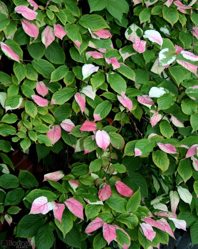 .Diese Pflanze hat große Blätter. Die rosa-weiß gespritzten Blätter sehen aus, als wären sie in weiße Farbe getaucht. Es sind Juwelen, die man sehen kann. Actinidia ist absolut winterhart und zeigt seine farbenfrohen Farben am besten an einem sonnigen Standort.