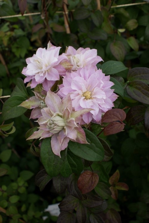 .Eine lila-rosa Clematis mit gefüllten Blüten. Die Blütezeit ist Mai-Juni. Für eine zweite Blüte muss diese Clematis im Juni (nach der ersten Blüte) auf eine Höhe von 75 cm zurückgeschnitten werden.