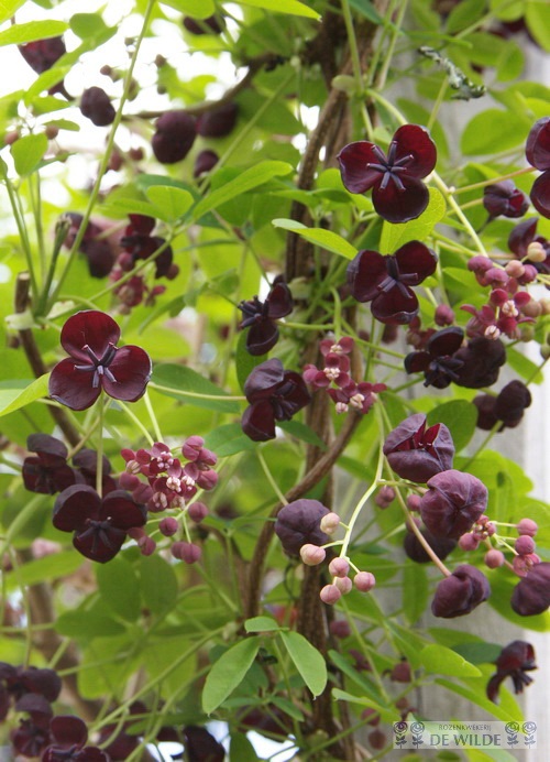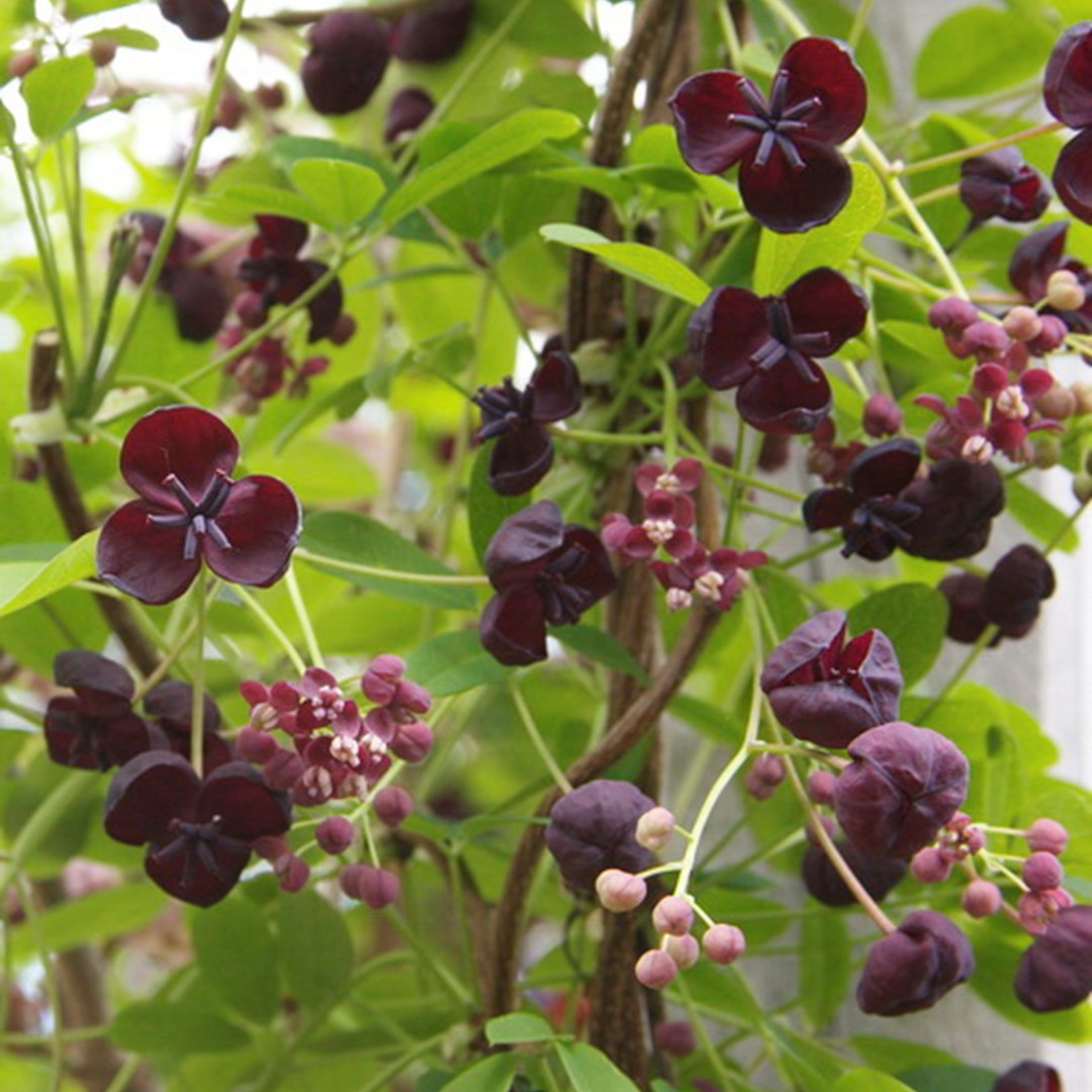 Akebia quinata ist eine früh blühende, halbimmergrüne Kletterpflanze mit duftenden Blüten. Die Farbe der Blüte ist violettbraun mit etwas Lila. Akebia quinata blüht im Zeitraum April bis Mai.