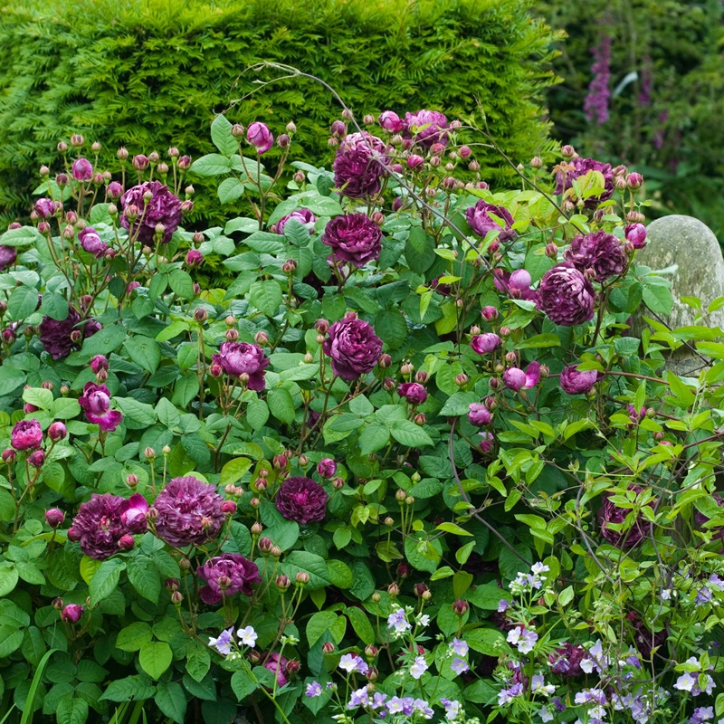Der 'Cardinal de Richelieu', auch bekannt als die Rose von Sian, hat fast kugelförmige Blüten, die sehr dunkelviolett sind. Die Blütenblätter in der Mitte haben einen etwas helleren Farbton. Das Laub ist dunkelgrün und der Strauch hat wenige Dornen. Diese Rose ist leicht duftend und wird ca. 120 cm hoch. Pflanze 3 Rosen pro m2.