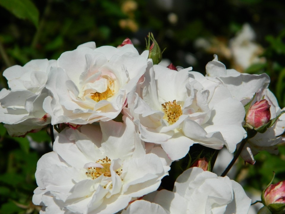Halbgefüllte, weiße Blüten mit gelben Staubfäden auf einem buschigen Strauch, der sich gut verzweigt. Wird oft als Hochstammrose verwendet.