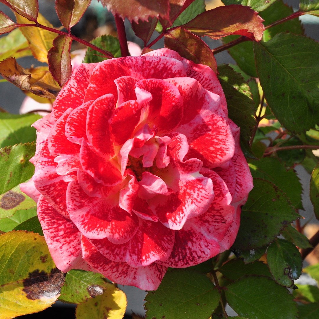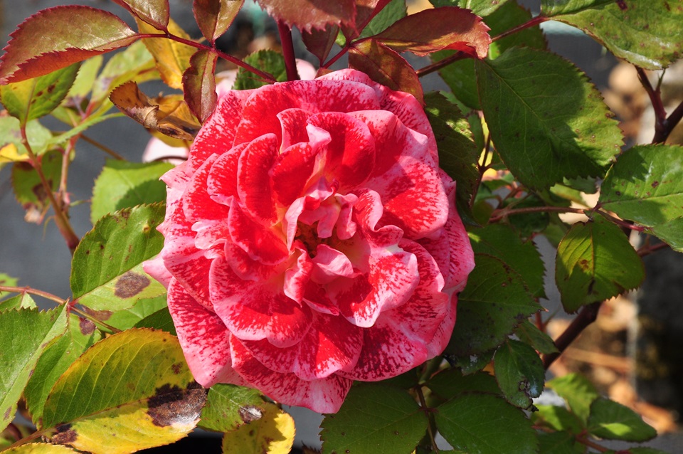 Wunderschöne blühende Strauchrose mit bunten Blüten.