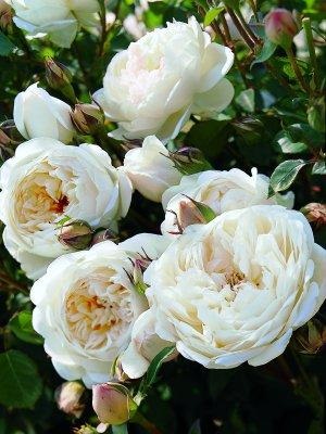 Das 'Glamis Castle' blüht mit rein weißen, schalenförmigen Blüten, die nach Myrrhe riechen. Diese Rose hat einen ziemlich kurzen und buschigen Wuchs mit zahlreichen Zweigen, auf denen die Blüten reichlich und ununterbrochen blühen. Die Blüten haben einen Durchmesser von ca. 9 cm und erscheinen in der Blütezeit von Mai bis Oktober. Das 'Glamis Castle' eignet sich besonders für Bordüren und Beete. Die Rose wird etwa 90 cm hoch. Pflanze 3 Rosen pro m2.