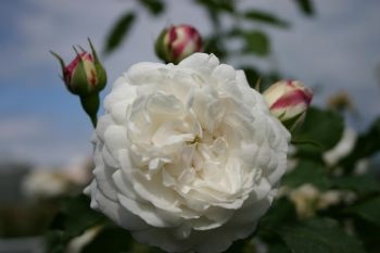 'Boule de Neige' hat weiße, wohlgeformte Blüten mit einer seidigen