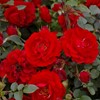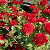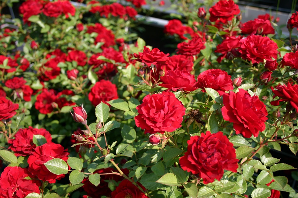 Feste Zweige am sehr starken, buschigen Strauch tragen hellgrüne Blätter und dunkle blutrote, halbgefüllte Blüten mit einem Durchmesser von 6 cm.