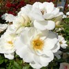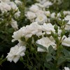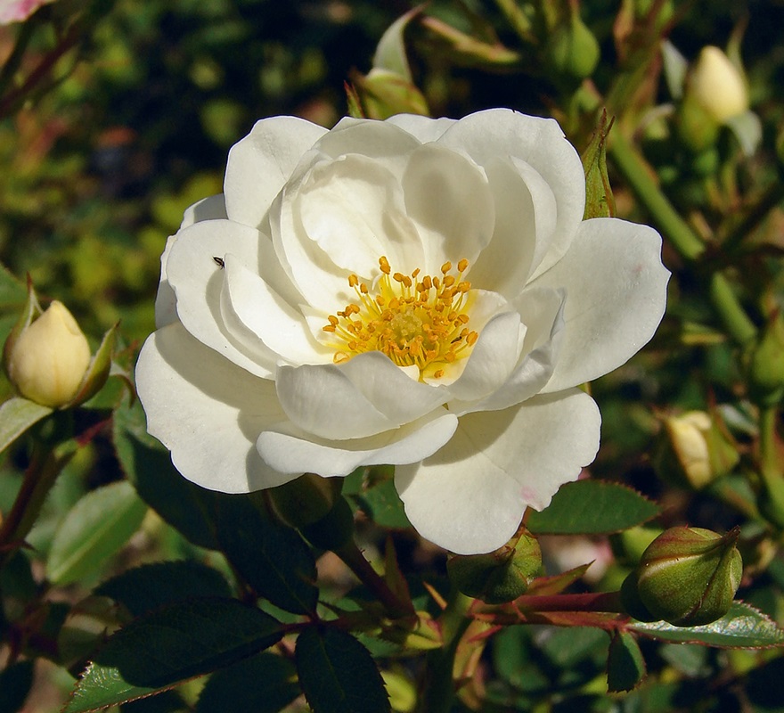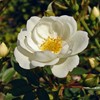 Halbgefüllte, weiße Blüte mit gelben Staubfäden auf einem buschigen