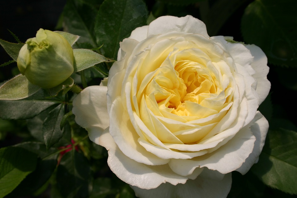 Große, dekorative Blumen mit einem weichen Duft in einem Elfenbein-weiße Farbe. Es ist ein rosa Röte auf den Rosen.