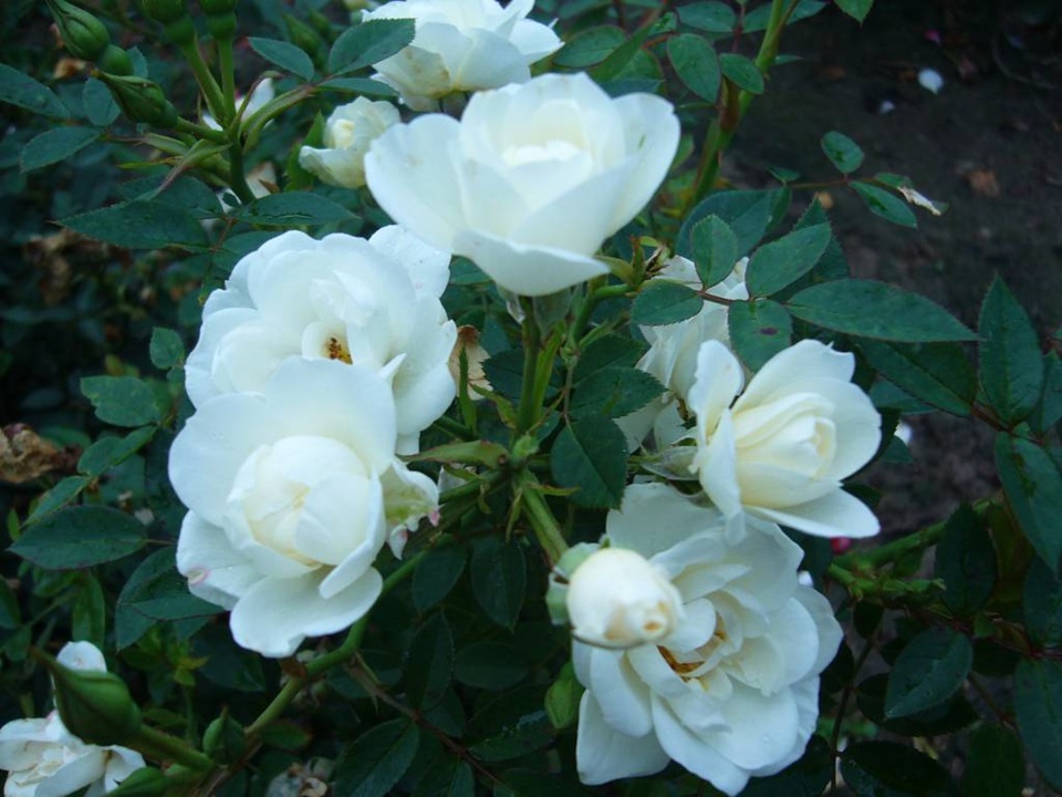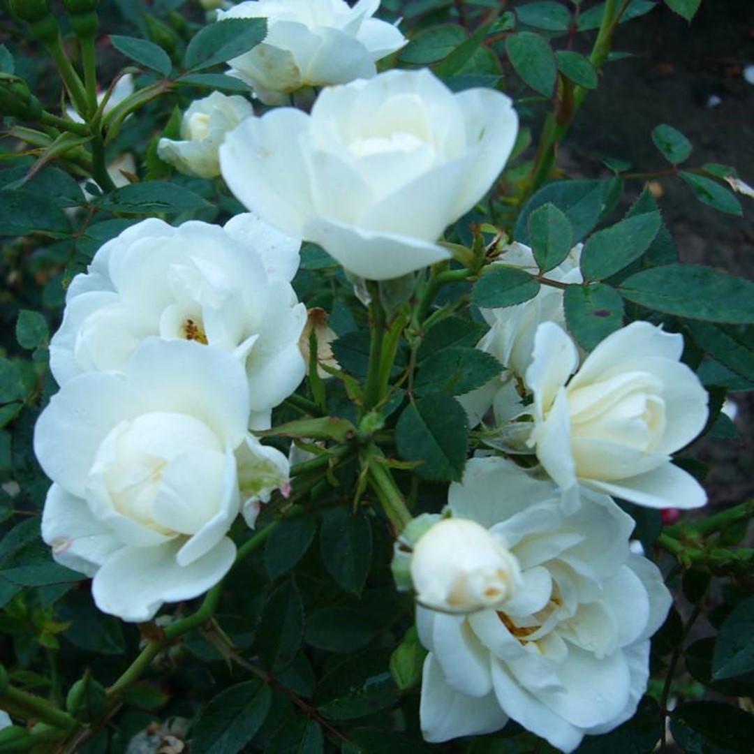 Diese Buschrose entwickelt große Dolden mit kleinen bauschigen Blüten und dunkelgrüne Blätter.