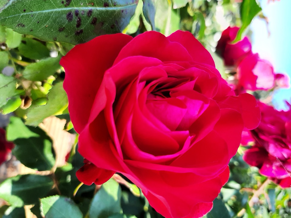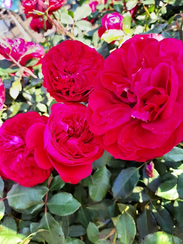 Diese Rose hat wunderschöne rote Blüten, die den ganzen Sommer über blühen. Sie blühen in Büscheln und haben wunderschöne gefüllte Blüten.