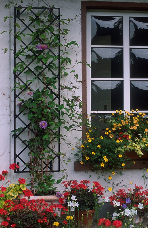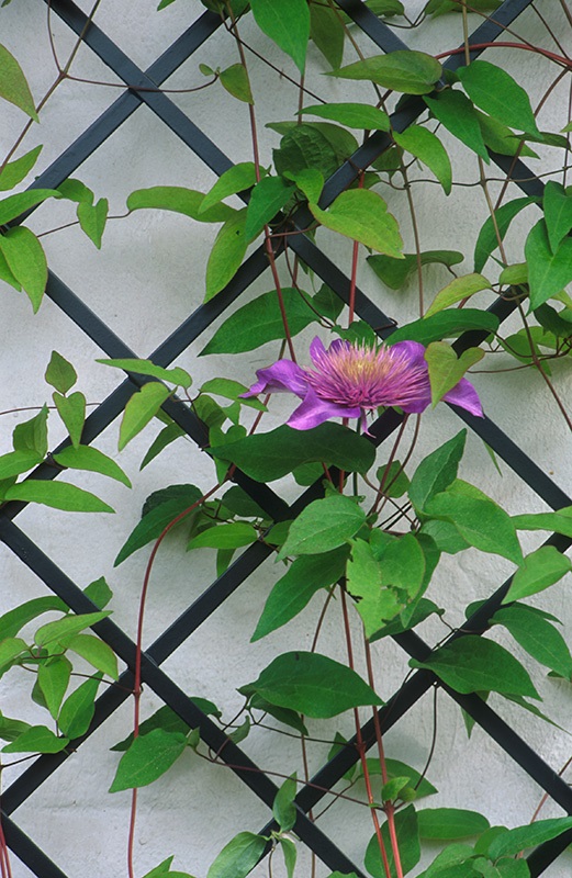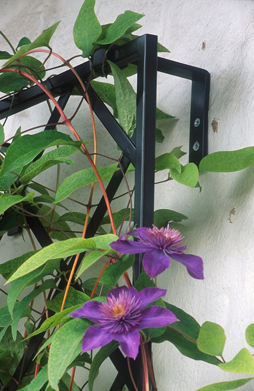 Dieses Spalier aus Schmiedeeisen hebt sich von anderen Pflanzenträgern ab. Auch ohne Pflanzen verleihen sie Ihren Wänden Charakter und Klasse. Sie sind voller Blumen und bilden eine wunderbare Verbindung zwischen dem Garten und dem Haus.