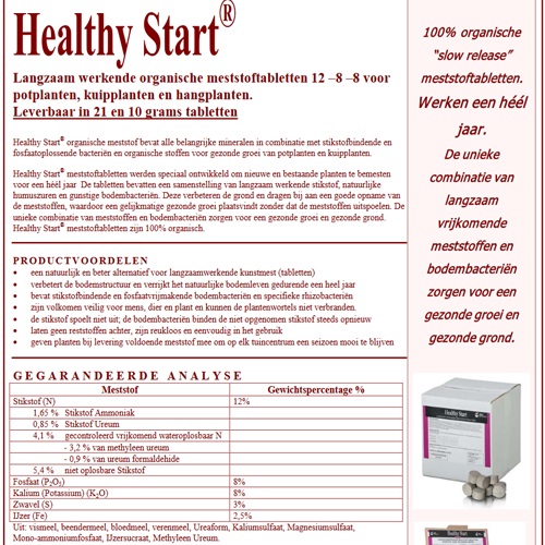 Einfacher geht es nicht. Sie drücken 1 oder mehrere Healthy Start-Tabletten in den Boden um die Pflanzen. Auf diese Weise erhält die Pflanze ein Jahr lang 100% organischen Dünger, Huminsäuren und nützliche Bodenbakterien. Alles, was Sie tun müssen, ist Wasser zu geben. Verwenden Sie 1 Tablette pro 4-5 Liter Blumenerde für eine optimale Düngung. 5 Tabletten pro Packung. 1 Tablette wiegt 21 Gramm.