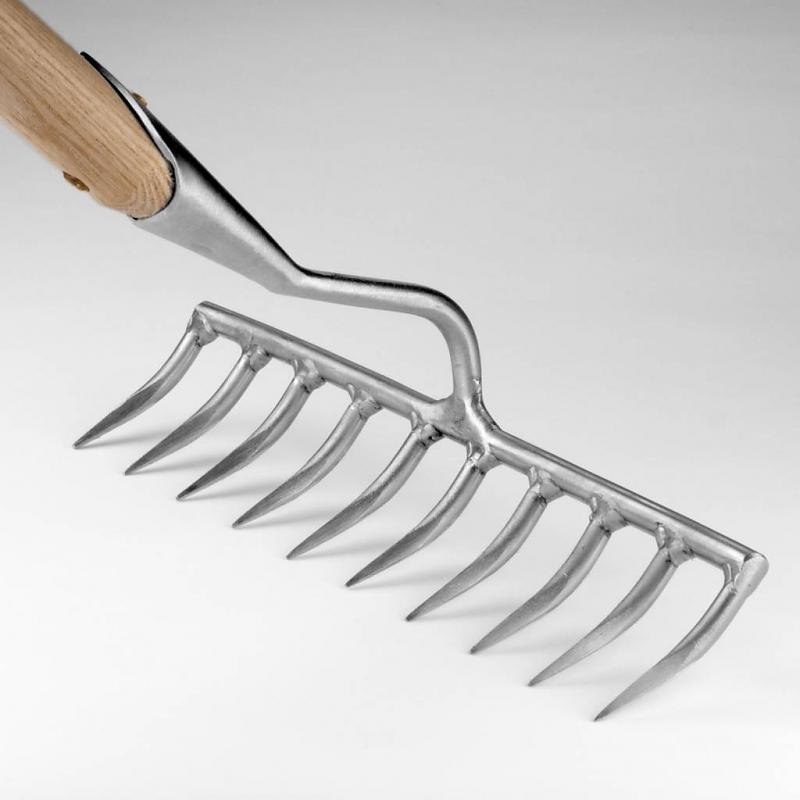 Gebogene Zähne, vorne und hinten geschliffen, schneiden durch festen Boden. Der Gartenharke ist das perfekte Werkzeug, um den Garten aufzuräumen und kleine Saatbeete vorzubereiten.