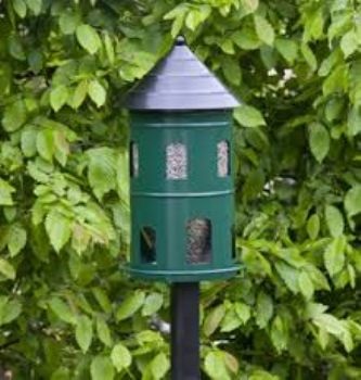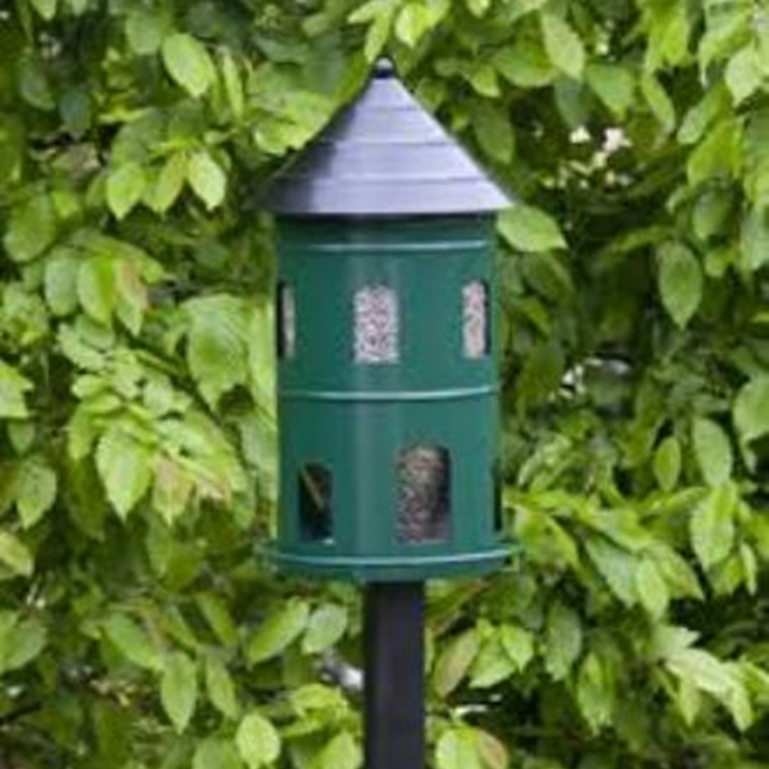 Dieses extra große Futterhaus muss nur gelegentlich mit dem großen 6-Liter-Futterbehälter aufgefüllt werden. Dieser herausnehmbare Behälter ist leicht zu befüllen und zu reinigen. Das Vogelfutter ist gut gegen Verschmutzung und Feuchtigkeit geschützt. Die Futterspender sind so konzipiert, dass ungezogene Vögel das Futter nicht ausbreiten können und größere Vögel das Futter nicht so leicht erreichen, sodass die kleineren Vögel ruhig fressen können. Der Gigantmatare verfügt über mehrere Futterspender, so dass viele Vögel gleichzeitig fressen können. Die Riesenmatare wird mit der mitgelieferten Schraube an einer Stange befestigt. Das Futterhaus besteht aus wasserbeständigem pulverbeschichtetem Stahl und der Behälter aus recycelbarem PC-Kunststoff
