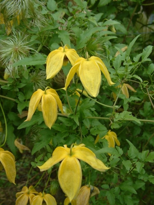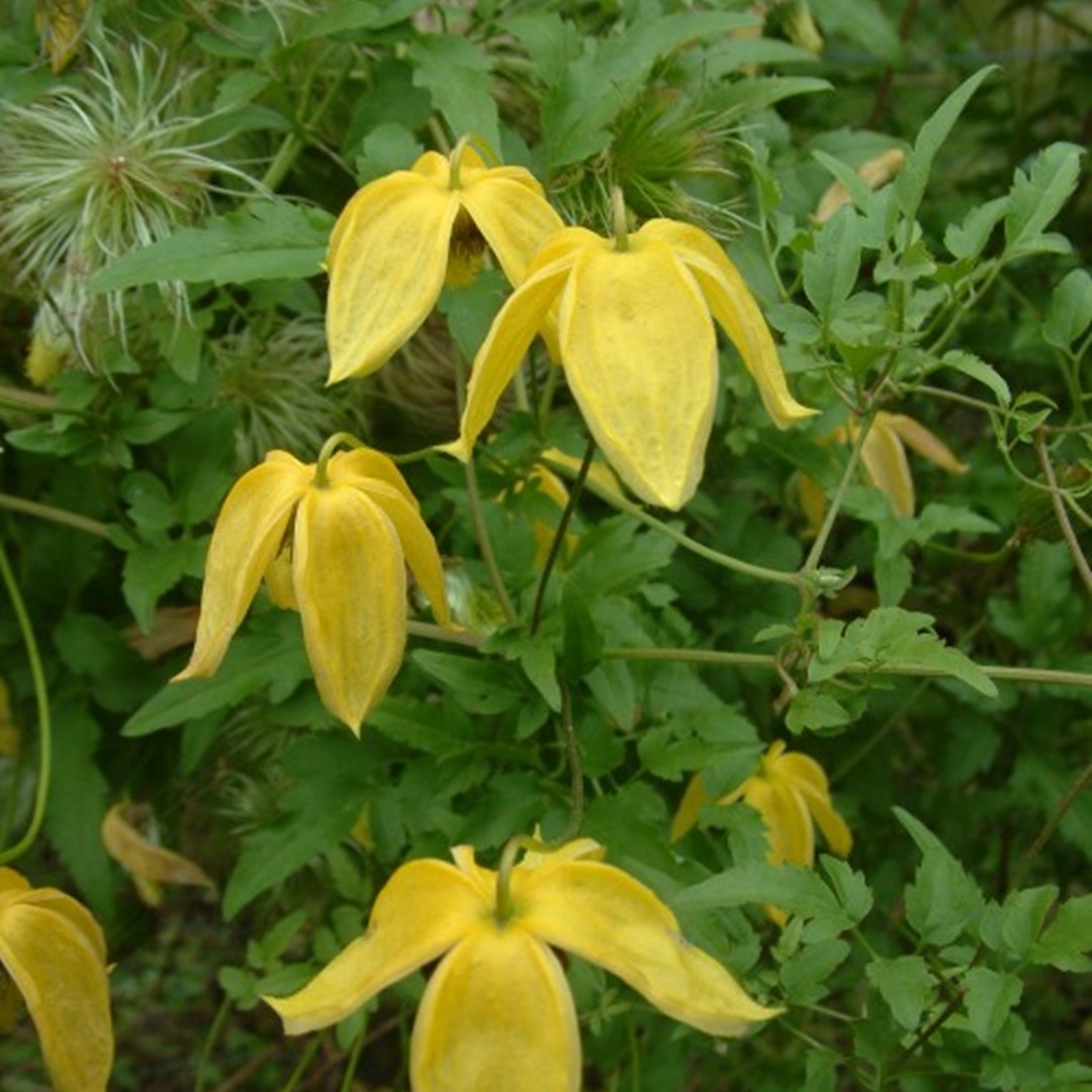 Fruit fluff bearing clematis with a yellow bell-shaped flower of approximately 5 cm. The clematis 'Lambton Park' blooms in the period from June to August and should be pruned to a height of 75 cm in the spring.