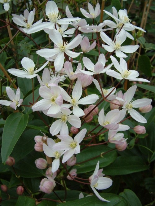 Evergreen, but moderately hardy clematis. Small soft pink scented flowers with a size of 5 to 6 centimeters. Blooms in the period from March to May. Fragrant.