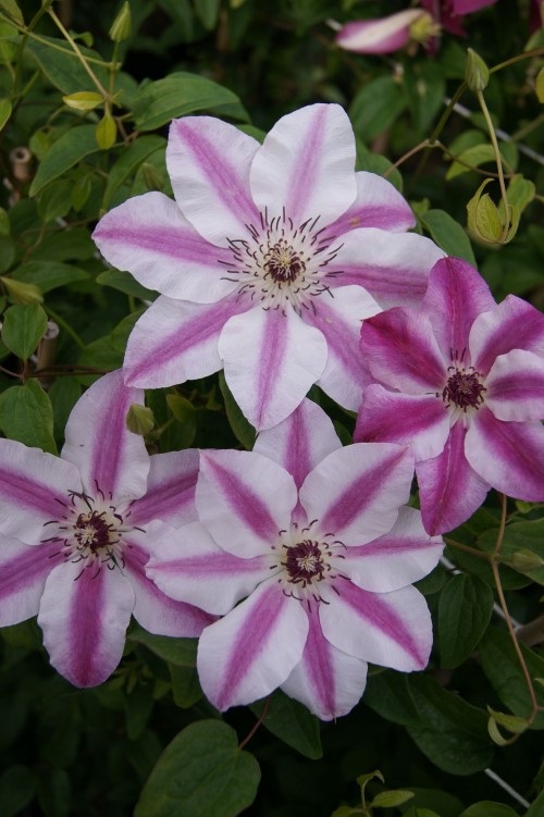 .Soft pink flowers with dark pink stripes. The flowers have a diameter of 10 to 12 cm. Blooms in May and June, after this flowering when pruning. Blooms again in July and August.