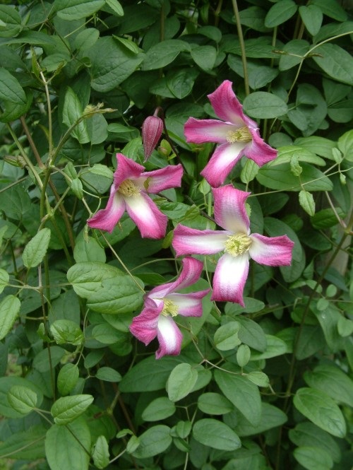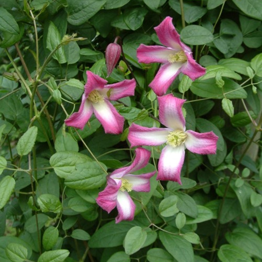 Purple-red with white bell-shaped flower with a size of 4 to 5 cm. Blooms from June to August. Prune in February or March to a height of 30 cm.