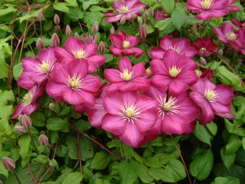 The 'Ville de Lyon' clematis flowers red / pink flowers with a diameter of 8 to 10 cm. The flowering time of the plant is from June to August. The plant prefers to be in fertile soil in the partial shade or in the sun. This clematis is pruned in March / April and must be pruned to a height of 75 cm.