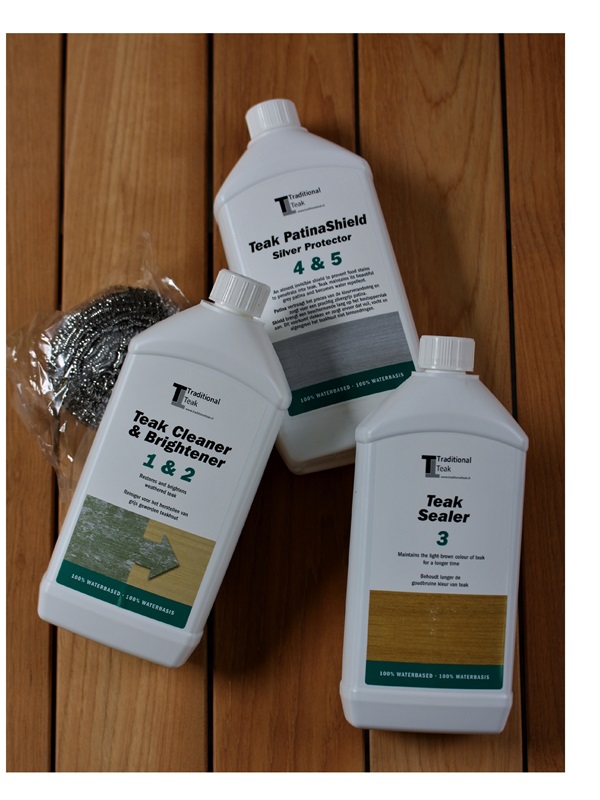 To make the furniture water and dirt repellent, we recommend that you treat the furniture with Teak PatinaShield 4 & 5 (even if you do not opt for a longer golden-brown color / Teak Sealer 3). The Patina slows down the process of color change and ensures for a beautiful silver gray patina. The Shield applies a protected layer to the wood surface. This prevents stains and ensures that dirt, moisture and algae growth do not penetrate the teak.