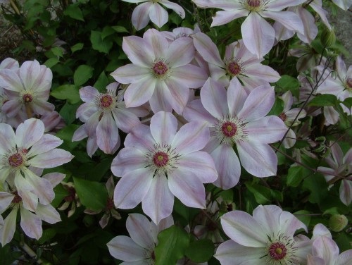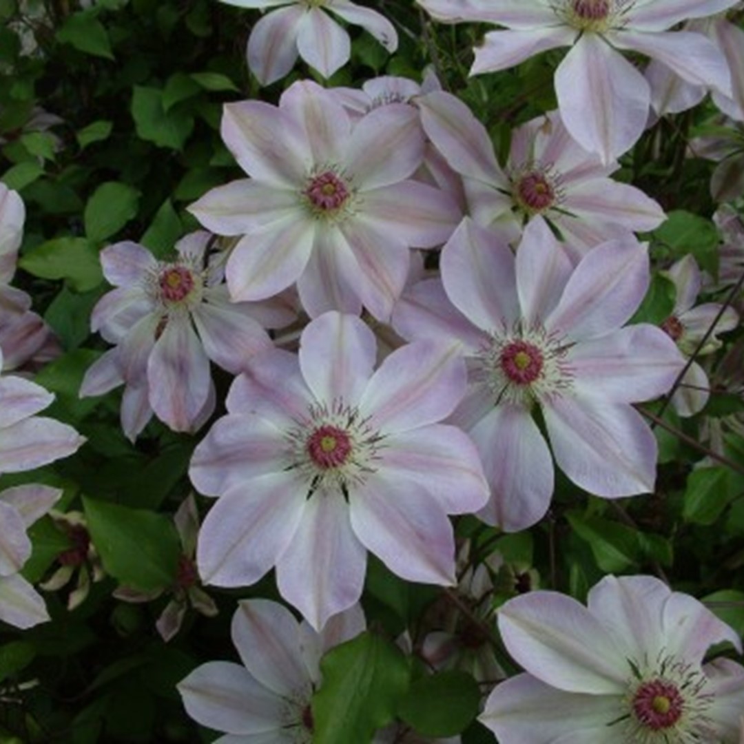 Large, very light pink flowers with a diameter of 10-15 cm. The clematis 'Dawn' blooms from June to September. The height of the plant is 2 meters and the pruning height is approximately 75 cm.