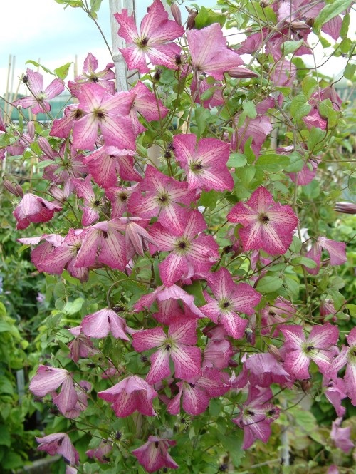 A winter-hardy climbing plant with stems up to 3 m long for a sunny spot in your garden. Leaf is pinnate and normally green. Flowers 5-6 cm across, nodding to almost horizontal, open bell-shaped to almost spreading. 4 Petals (sometimes 5 or 6), purple-red with almost white in the center. Style is dark red-purple. Flowering period is from June to September. Prune in March at 25 cm above the ground.
