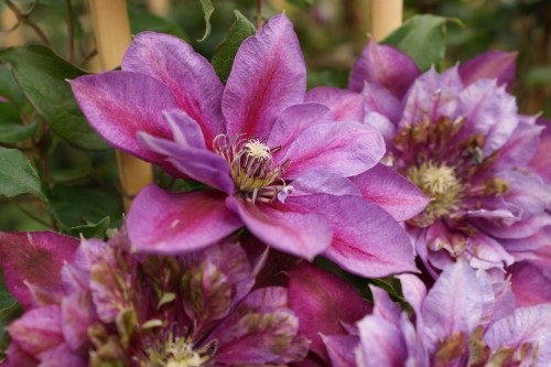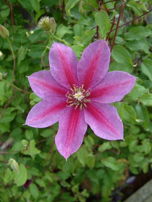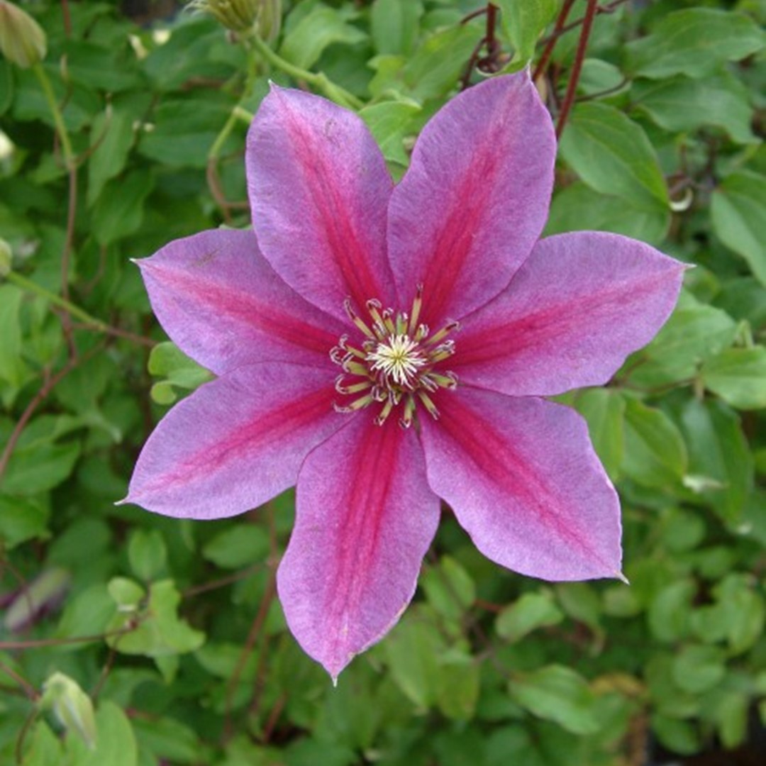 A hardy climbing plant with stems up to 200 cm long but shorter when grown in a pot. Leaf is normal green with a purple edge. Flowers erect, spreading and 7-10 cm across. Petals have a red stripe, the spring flowers are double (like a collared dahlia) and the summer flowers are single. Flowering period May and June and again from July to September. Prune slightly after the first flowering in June. Winter hardy in the Netherlands. Prune in February to 25 cm above the ground. Further information can be found in 'Pruning Clematis' on the main climbing plants page.