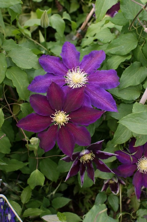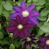 Blooms twice; in May and June on the old wood and again in July and August on the young shoots. Large purple flower with red stripe with a diameter of 10 to 12 cm.