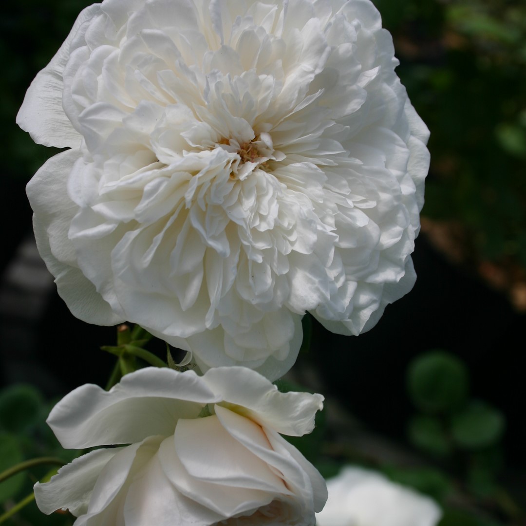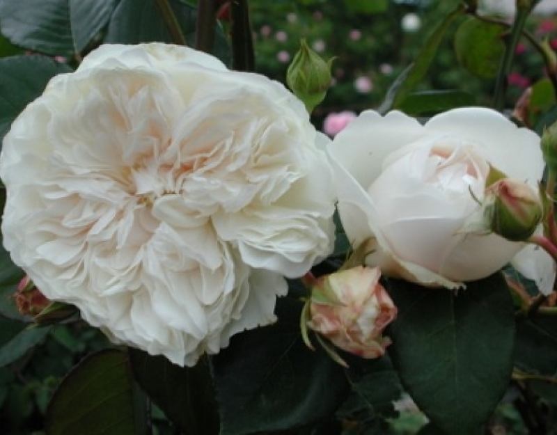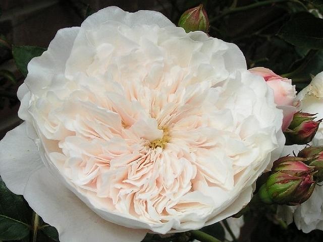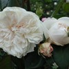 Flat flowers in a rosette form in cream, sometimes tinged with