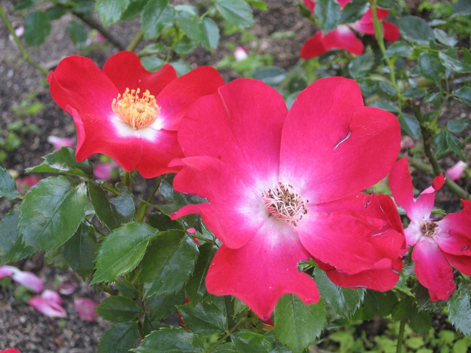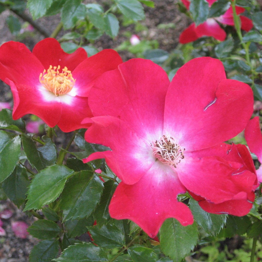 Large single bright red flowers with a white heart. Strong continuous bloomer. Dark glossy leaves. Height up to 250 cm.