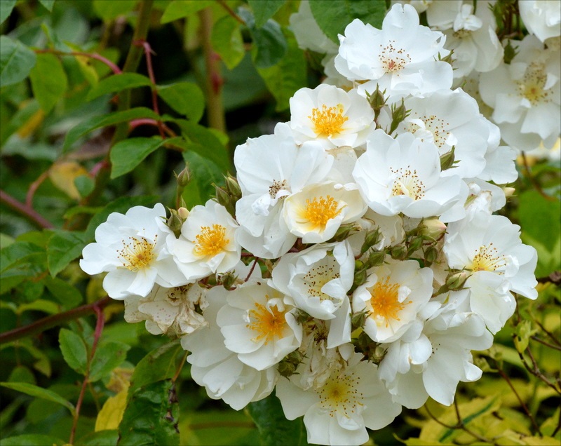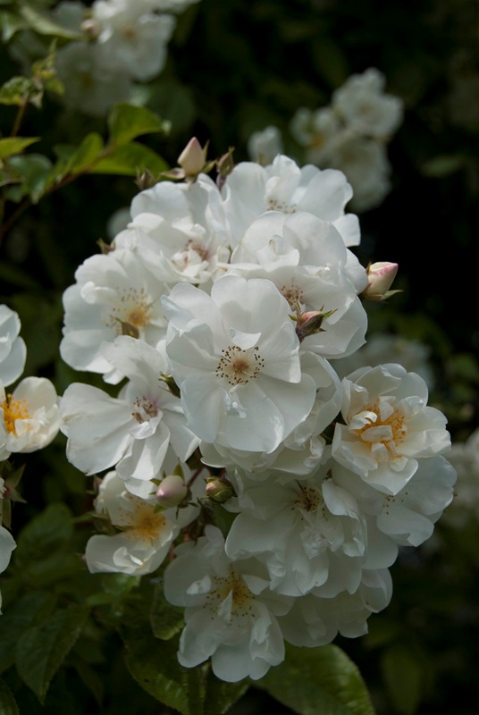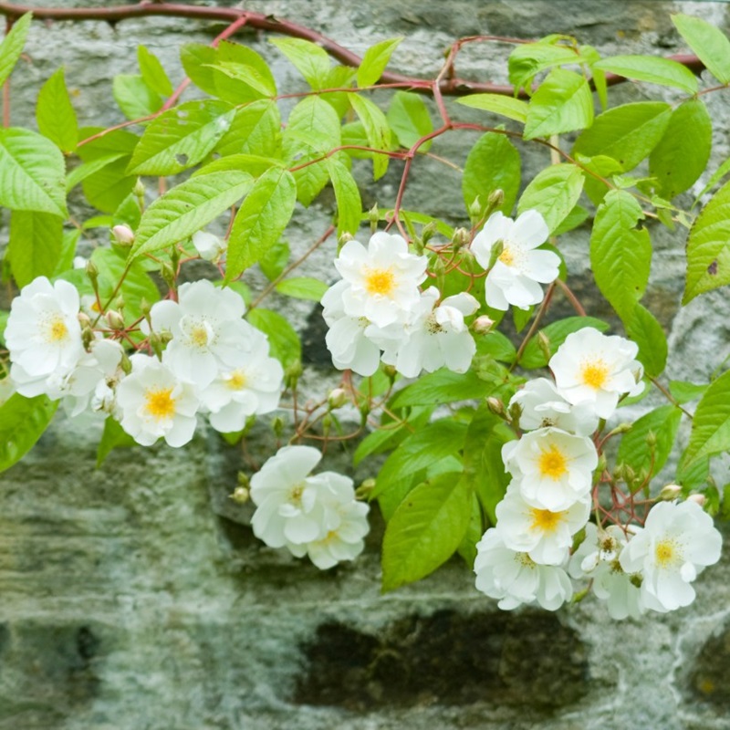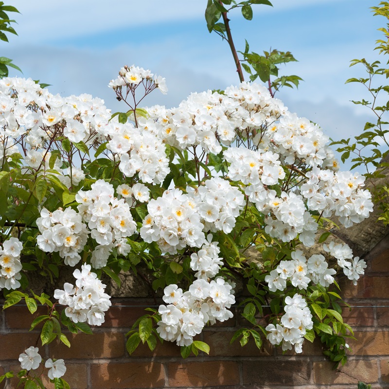 An enormous rambler rose with very large, glossy cream white half full flowers. This rose is ideal for covering large areas; for pergolas and ugly buildings, or to grow in a tree. Very scented.