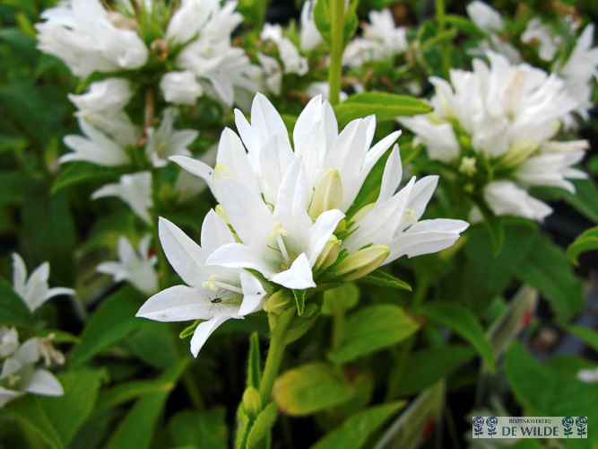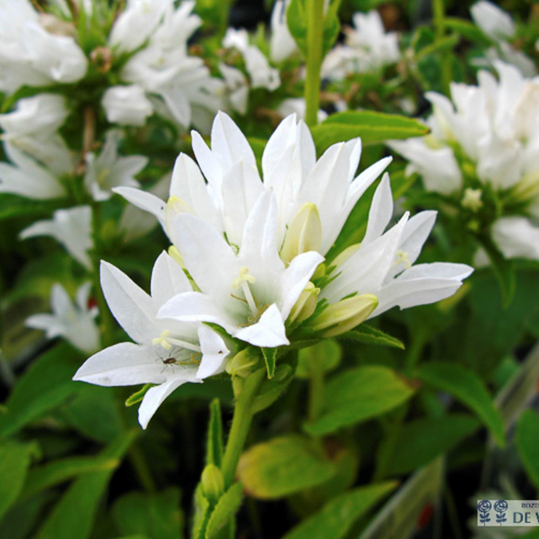 Het geeft een rijke bloei van mei t/m augustus in de vorm van witte kelken die omhoog wijzen.