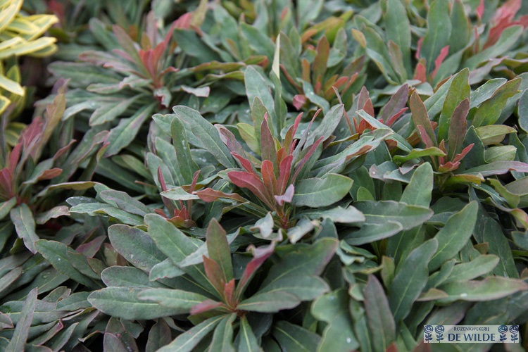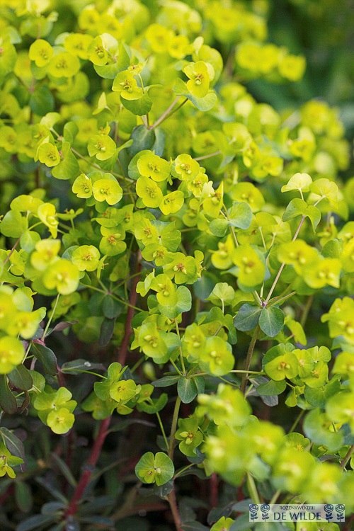 Euphorbia amygd. Purpurea bloeit in april t/m juni met geel/groene bloemen.