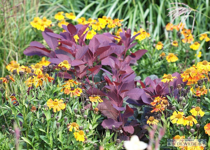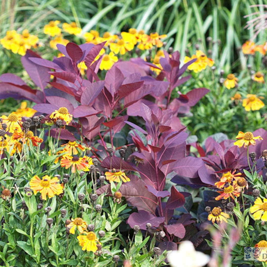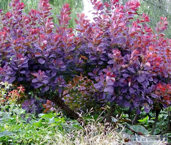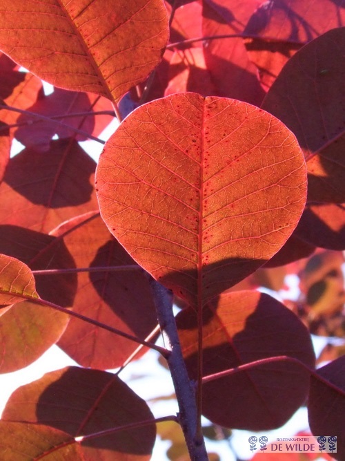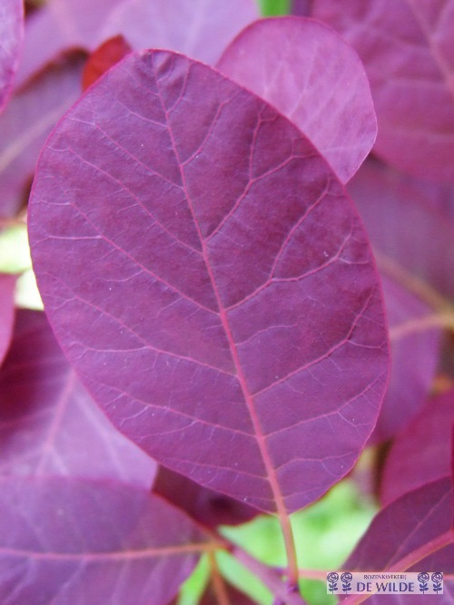 De struik heeft zeer attractief purperrood blad. Op het moment dat de bladeren ouder worden krijgen ze een goudkleurig randje. Na de bloei groeien de bloemsteeltjes nog door, waardoor u in de zomer een soort pluizige bossen boven het blad ziet. De herfstkleur varieert van geel tot rood.