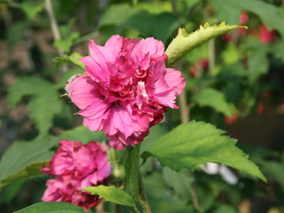Hibiscus syriacus 'Duc de Brabant' bloeit van juli tot en met september