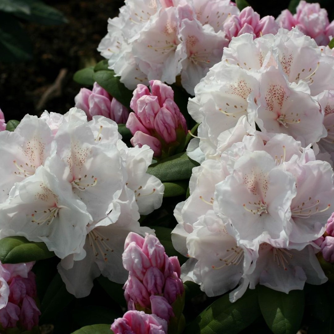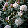 De 'Rhododendron Schneekrone' is een groenblijvende plant die bloeit vanaf half mei met witte/roze bloemen.