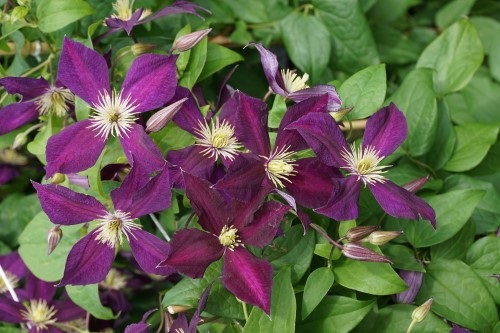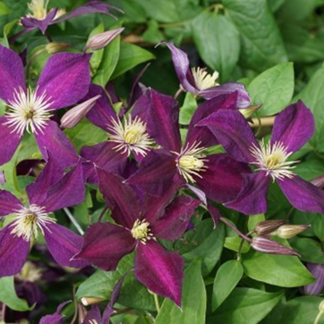 Donkerpaarse bloem met een diameter van 5 tot 8 centimeter. Bloeit van juni tot en met augustus. In het voorjaar terugsnoeien tot 25 cm.