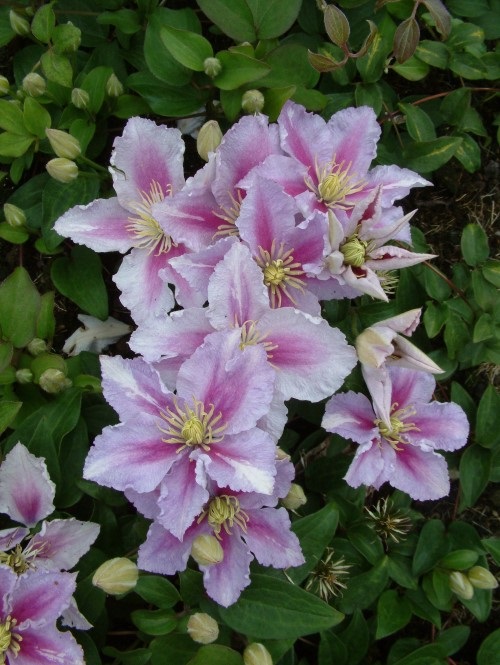 Roze met paars gestreepte bloemen met een grootte van ca. 8 cm. Bloeit van mei tot en met juni en opnieuw van juli tot en met augustus, tijdens de eerste bloei zijn de bloemen gevuld.