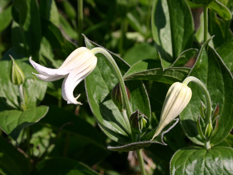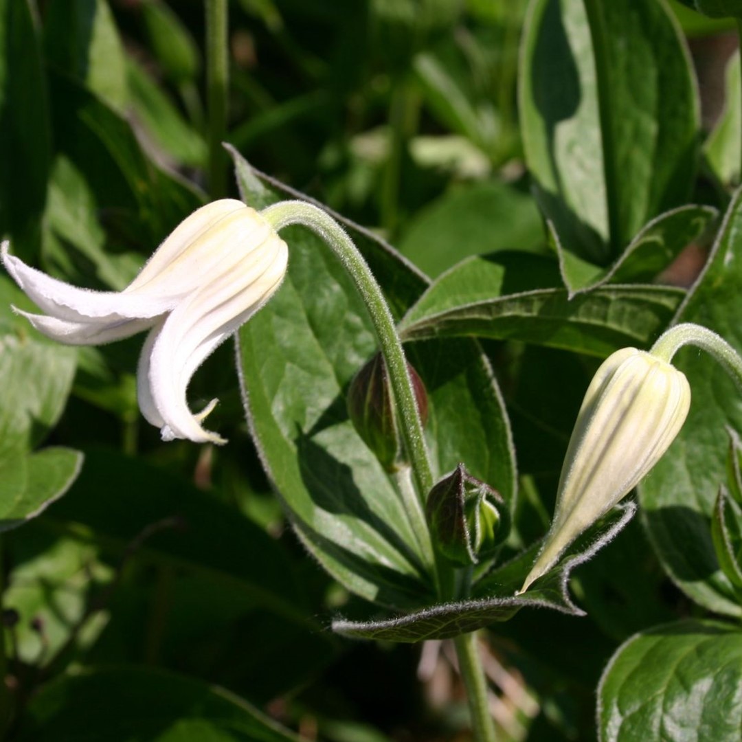 Een laagblijvende (50 cm hoog) clematis met witte bloemen klokvormige bloemen van ca. 5 cm groot. Bloeit van juni tot en met augustus. In het voorjaar snoeien tot 10 cm hoogte.
