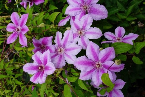 Lichtroze bloem met een diameter van 10 tot 15 cm met donkerrood/roze strepen. Bloeit van mei tot juni en van juli tot augustus. Na de eerste bloei licht snoeien en slechte en dode takken verwijderen.