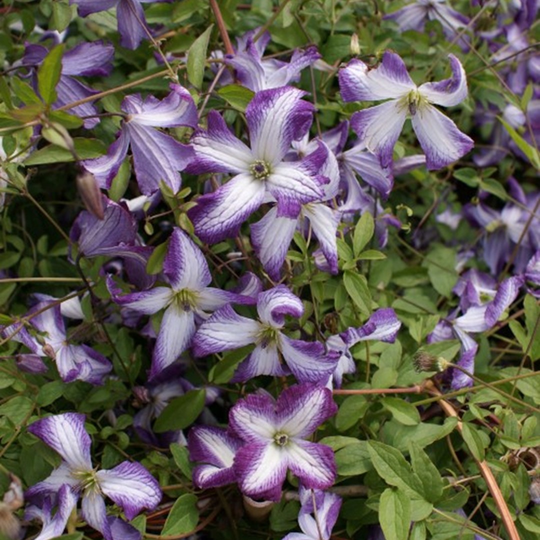 Geselecteerd voor de zeer rijke bloei en de heldere bloemkleuren in donker violet met wit.