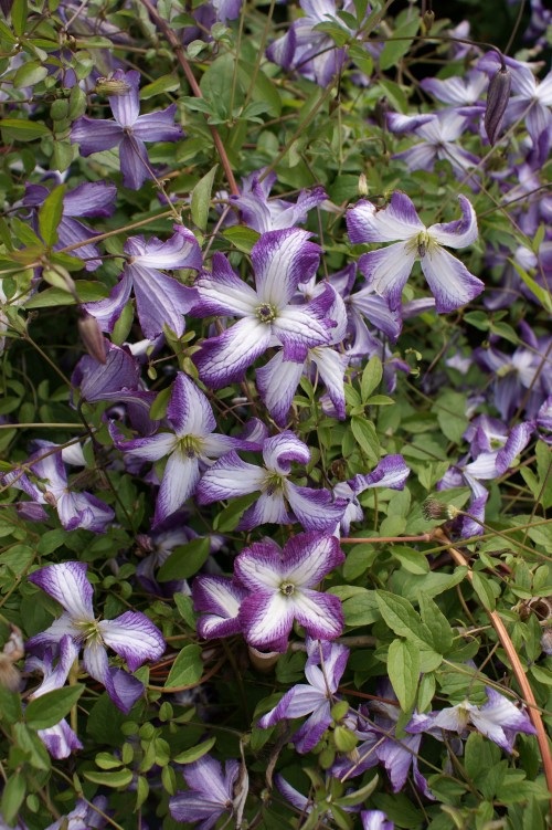 Een witnerharde klimplant met stengels tot 250 cm lang. Blad geveerd, normaal groen. Bloemen 5-6 cm doorsnede, open klokvormig, geknikt, wit met een rand in donker violet. Bloeitijd van juli tot in september.
