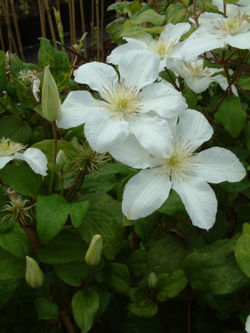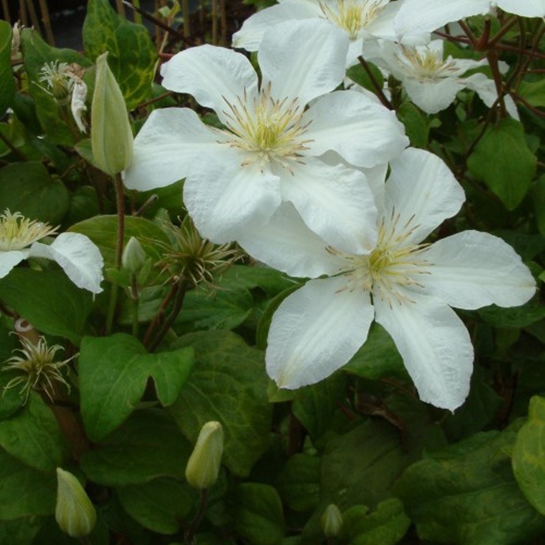 Grote witte bloemen met een diameter van 10 tot 12 cm. Bloeit van juli tot en met september. In het voorjaar terug snoeien tot een hoogte van 25 cm.