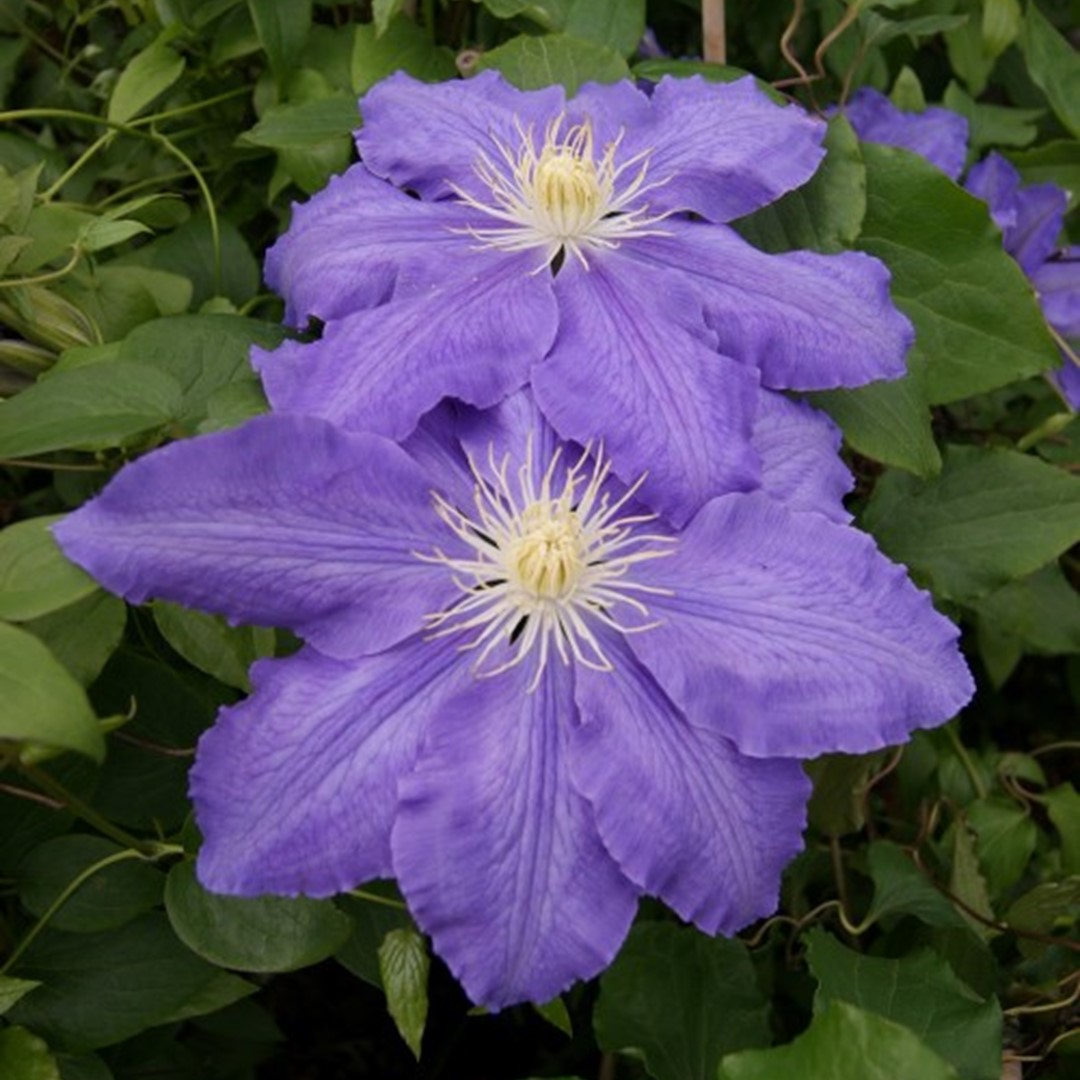 Grote violetblauwe bloemen van 10 tot 15 cm. Bloeit van mei tot juni en van juli tot augustus opnieuw. Na de eerste bloei licht bij snoeien.