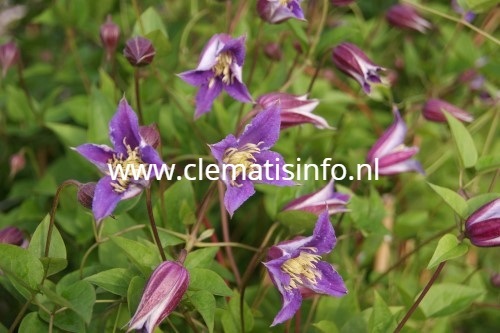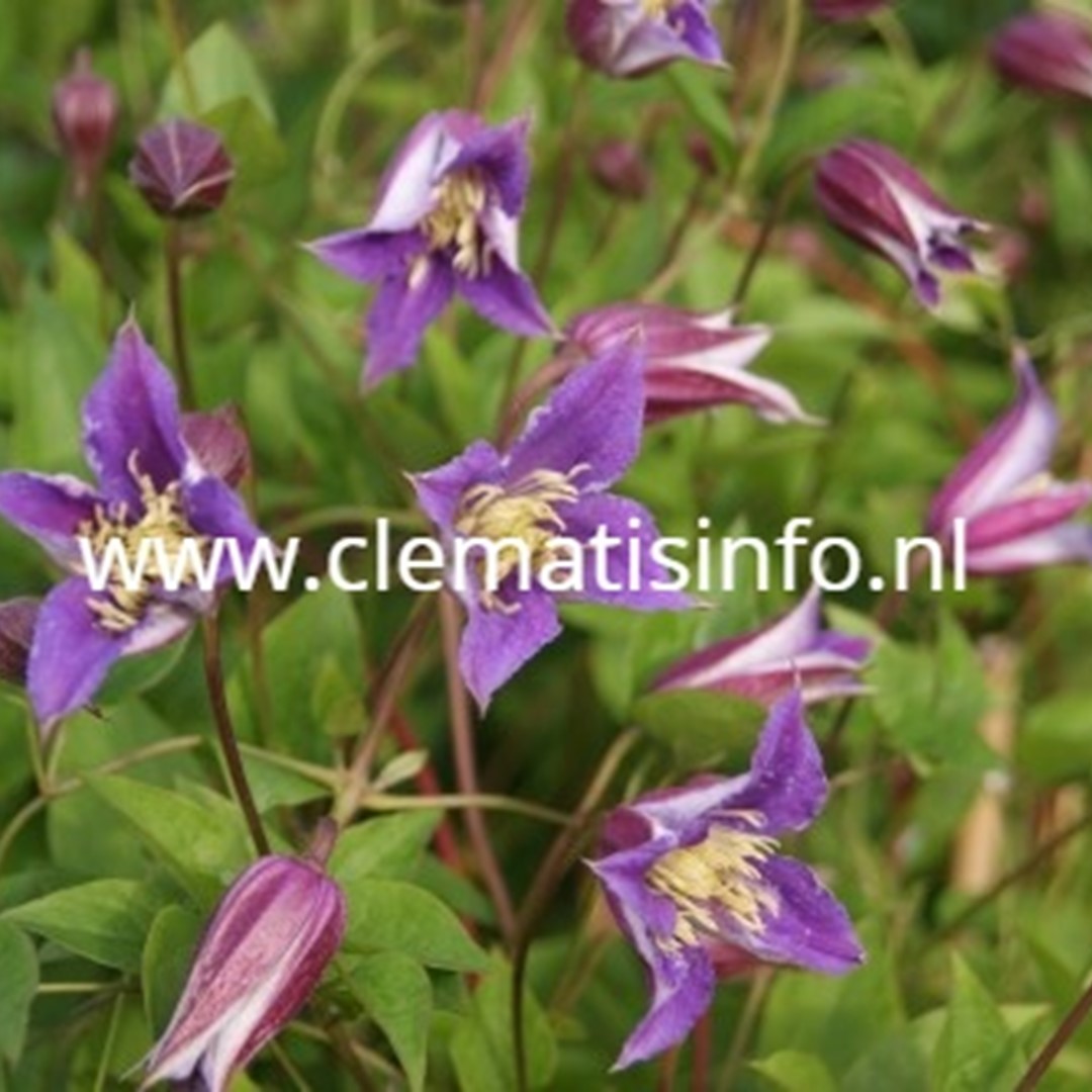 De clematis Prince William heeft rode bloemen en kan 3 meter hoog worden. Deze clematis bloeit van Juni tot September.