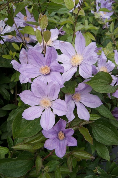 Een winterharde halfheester met stengels tot 1,70 m lang voor een zonnige plaats in de tuin. De bladeren zijn donkergroen. De bloemen hebbben een doorsnede van 5-7 cm en zijn licht violet-blauw met een donkere streep aan de achterzijde. De meeldraden zijn gelig. Bloeitijd eind juni tot in september. In maart afknippen op 10 cm boven de grond.