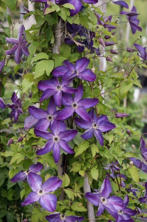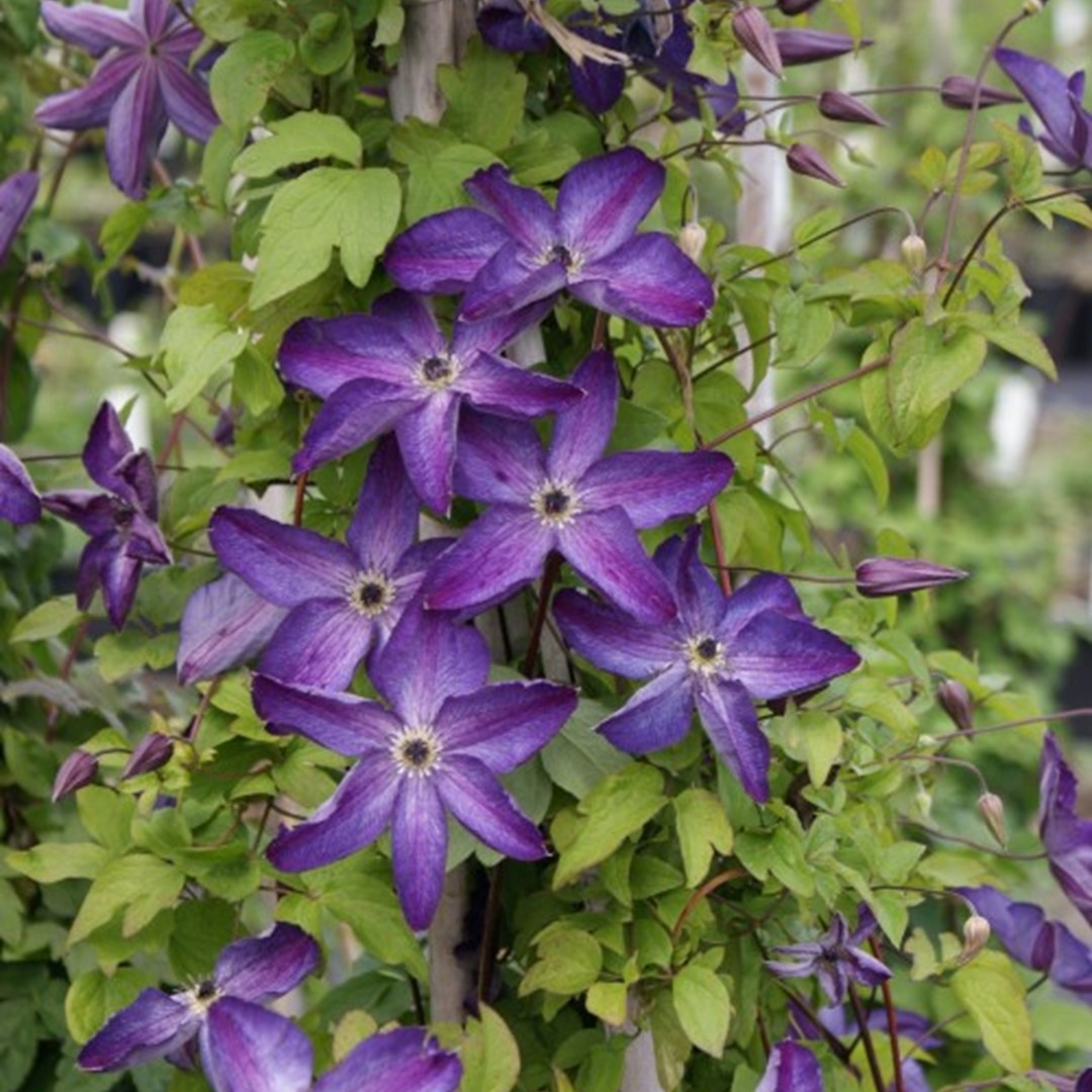 Violetkleurige bloem met in het hart witte strepen. Snoei in het voorjaar en verwijder oude takken om ruimte te maken voor nieuwe jonge scheuten.