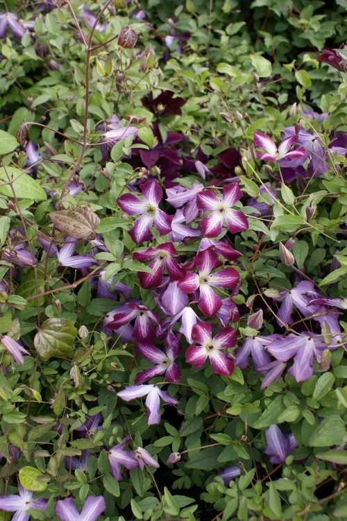 Paars met witte bloem met een diameter van 5-6 cm. In het voorjaar snoeien tot 25 cm